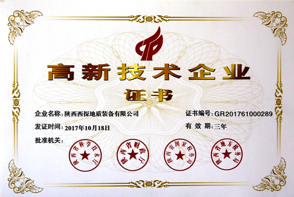 西探地質(zhì)裝備有限公司于近日榮獲由陜西省科學(xué)技術(shù)廳、陜西省財(cái)政廳、陜西省國家稅務(wù)局、陜西省地方稅務(wù)局聯(lián)合頒發(fā)的“國家高新技術(shù)企業(yè)”認(rèn)定證書,可享受高級(jí)人才引進(jìn)、國家稅收優(yōu)惠等多方面高新企業(yè)特有政策,在公司發(fā)展史上具有里程碑意義。