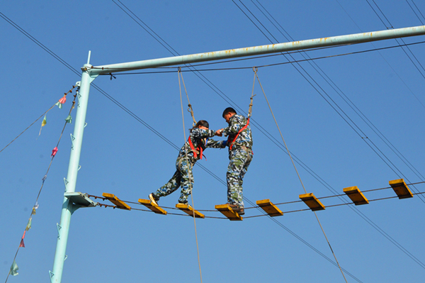 拓展訓練前,有針對性地進行了名為“信任隊友”的開訓儀式。通過一系列歡快的活動,打破了人與人之間的隔閡,建立起相互信任的基礎。訓練開始后,基地教練將參訓員工分為四組,前兩組進行了真人CS對戰,讓員工在體驗中放松自己,在真實對抗情境中激發出勇氣謀略和信念,增強集體意識和團隊責任心。后兩組進行了緬甸橋(高空走鋼絲)、木屐行走等項目,進一步增強了自信心和相互之間的信任,培養了樂于與人相處共事的積極態度。