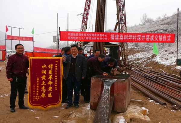 11月4日,九0八環(huán)境地質(zhì)公司完成的《延安革命老區(qū)綜合地質(zhì)調(diào)查水文地質(zhì)鉆探》順利通過中國地質(zhì)調(diào)查局西安地質(zhì)調(diào)查中心組織的野外驗收。西安地質(zhì)調(diào)查中心與九0八環(huán)境公司共同將該項目完成的一眼探采結(jié)合井移交給桑樹坪村,志丹縣水務局、順寧鎮(zhèn)政府以及桑樹坪村委會等領導和村民代表參加交接儀式。當?shù)馗刹咳罕娰浰途?八環(huán)境公司錦旗“情系革命老區(qū) 水潤黃土高原”,以表謝意。