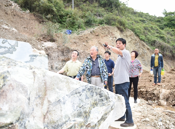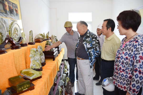 13日下午5時(shí)許,經(jīng)過近10個(gè)小時(shí)的顛簸,老部長一行驅(qū)車來到位于漢中米倉山腹地的南鄭縣漢元公司碑壩礦山。老部長察看了3個(gè)玉石采場,每到一處,都要用放大鏡、專用強(qiáng)光手電,仔細(xì)鑒別玉石顏色、品質(zhì)、透明度等地質(zhì)特征,不時(shí)地向隨行的礦山負(fù)責(zé)同志了解玉材生產(chǎn)、運(yùn)輸?shù)惹闆r。老部長還與一線職工親切交談,詢問他們的工作、生活和收入狀況,叮囑大家千萬要注意安全。