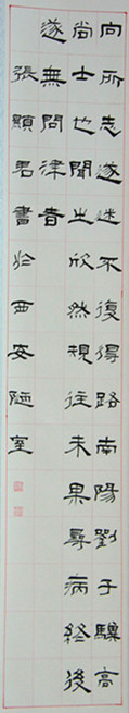 我的體會(huì)是,臨貼前一定要認(rèn)真讀貼,觀察所臨的字筆劃特點(diǎn),字型結(jié)構(gòu);其次是臨完一個(gè)字要與原貼對(duì)比,尋找差距,及時(shí)糾正,千萬(wàn)不能盲目的“抄貼”。三是要堅(jiān)持,不可“三天打魚(yú),兩天曬網(wǎng)”,一定要有恒心和毅力。就是每天寫(xiě)幾個(gè)字,也是貴在堅(jiān)持。學(xué)書(shū)法沒(méi)有捷徑可走,只有多寫(xiě),才能熟練,才能有所提高。經(jīng)過(guò)三年的臨貼,本人臨寫(xiě)的隸書(shū)《譚西精舎記》,2015年被入選陜西省第四屆書(shū)法篆刻臨貼展。