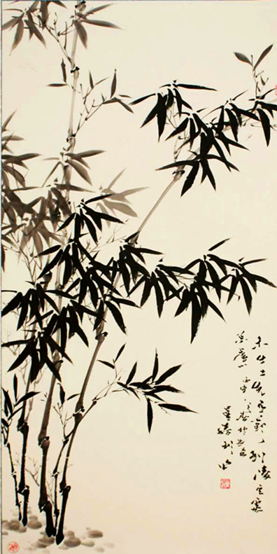 在創作方法上,必須把所要描繪的對象,通過觀察或寫生,把竹子的形象、結構特征默記在心,乃至風晴雨雪等不同的變化理解的清清楚楚。在動筆之前,一眼看去,仿佛千枝萬葉已躍然紙上。然后,將所要描繪的竹子,一枝一葉,一動一靜,用筆墨刻畫描繪出來。用筆要靈活,水墨干筆兼用,以水墨為主。畫時要從章法構圖到寫竿、撇葉、出枝,既要認真,又要膽大潑辣,有一股倔勁兒。要處理好大小、長短、經緯、疏密、濃淡、肥瘦、緩急、丘壑等辯證關系,以構成大局。使人看上去如破土而出的新筍,柔活中見骨力,風梢露葉,自然挺拔,俯仰多姿,形神兼備,生動活潑,一派生機。